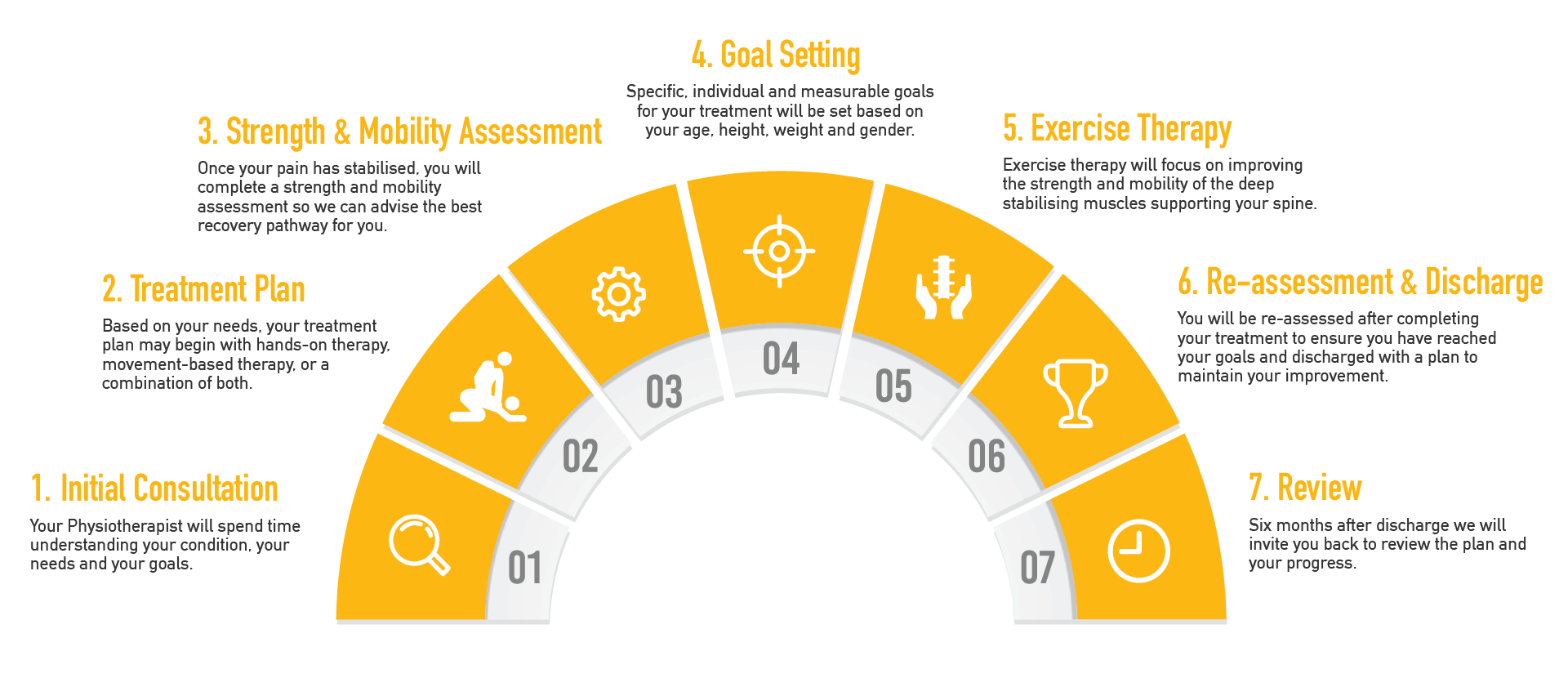 As you progress, we carry out a Re-assessment & Discharge. This ensures you’ve achieved your goals and gives you a plan to maintain your results.